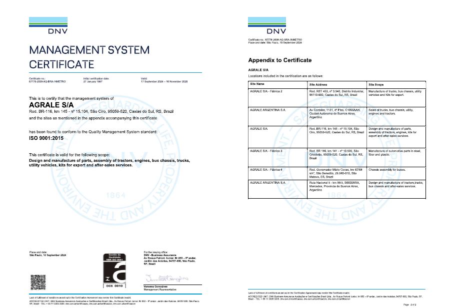Certificado Internacional de Garantia da Qualidade: CERTIFICADO ISO9001:2015 - Agrale S.A. Validade: Nov/2026