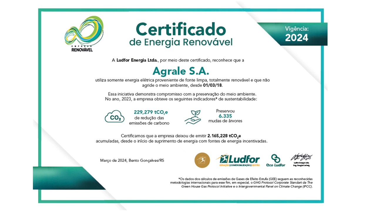 A Agrale S.A., na realização de suas atividades e no consumo de energia elétrica no seu parque fabril, reduziu em 2023, 229,279 toneladas de CO2, conforme informado no Certificado de Redução de Emissão de Gases de Efeito Estufa.
