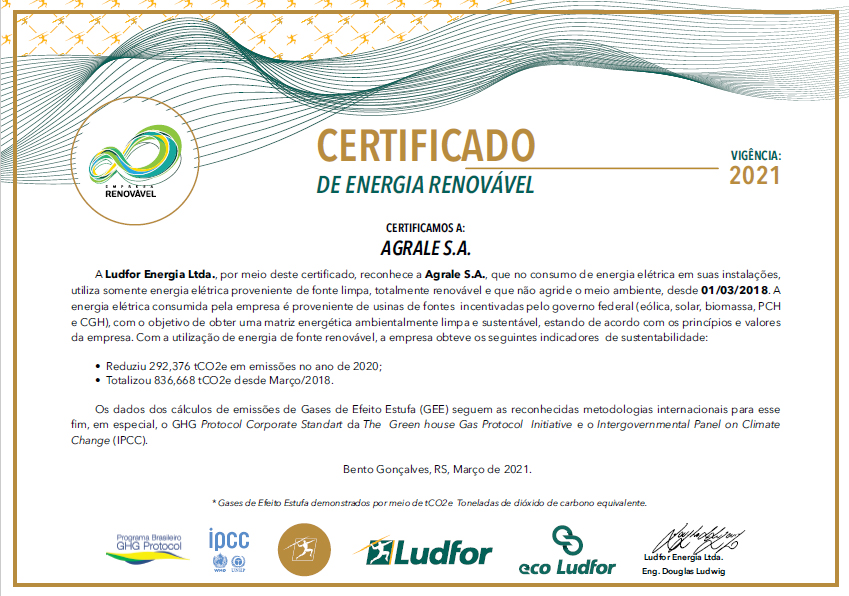 A Agrale S.A., na realização de suas atividades e no consumo de energia elétrica no seu parque fabril, reduziu 292,376 toneladas de CO2, conforme informado no Certificado de Redução de Emissão de Gases de Efeito Estufa.