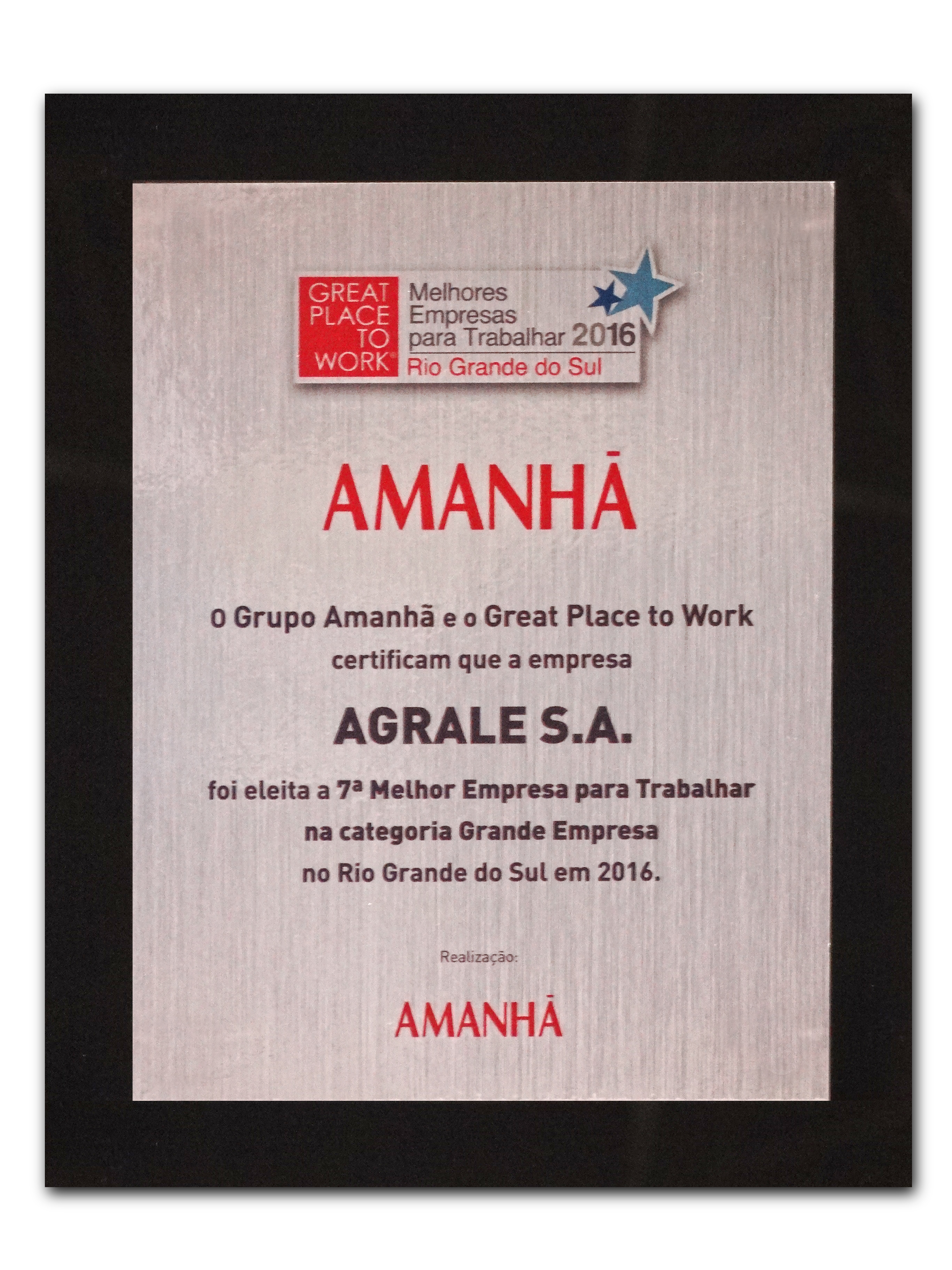 A Agrale ficou entre as 10 melhores grandes empresas do RS para trabalhar, de acordo com o ranking Great Place to Work (GPTW) Brasil, realizado em parceria com a Revista Amanhã. Foi a terceira vez que a companhia recebeu o reconhecimento. Nesta edição, a Agrale ficou na sétima posição entre 10 concorrentes no estado com mais de mil funcionários (Categoria Grandes Empresas).