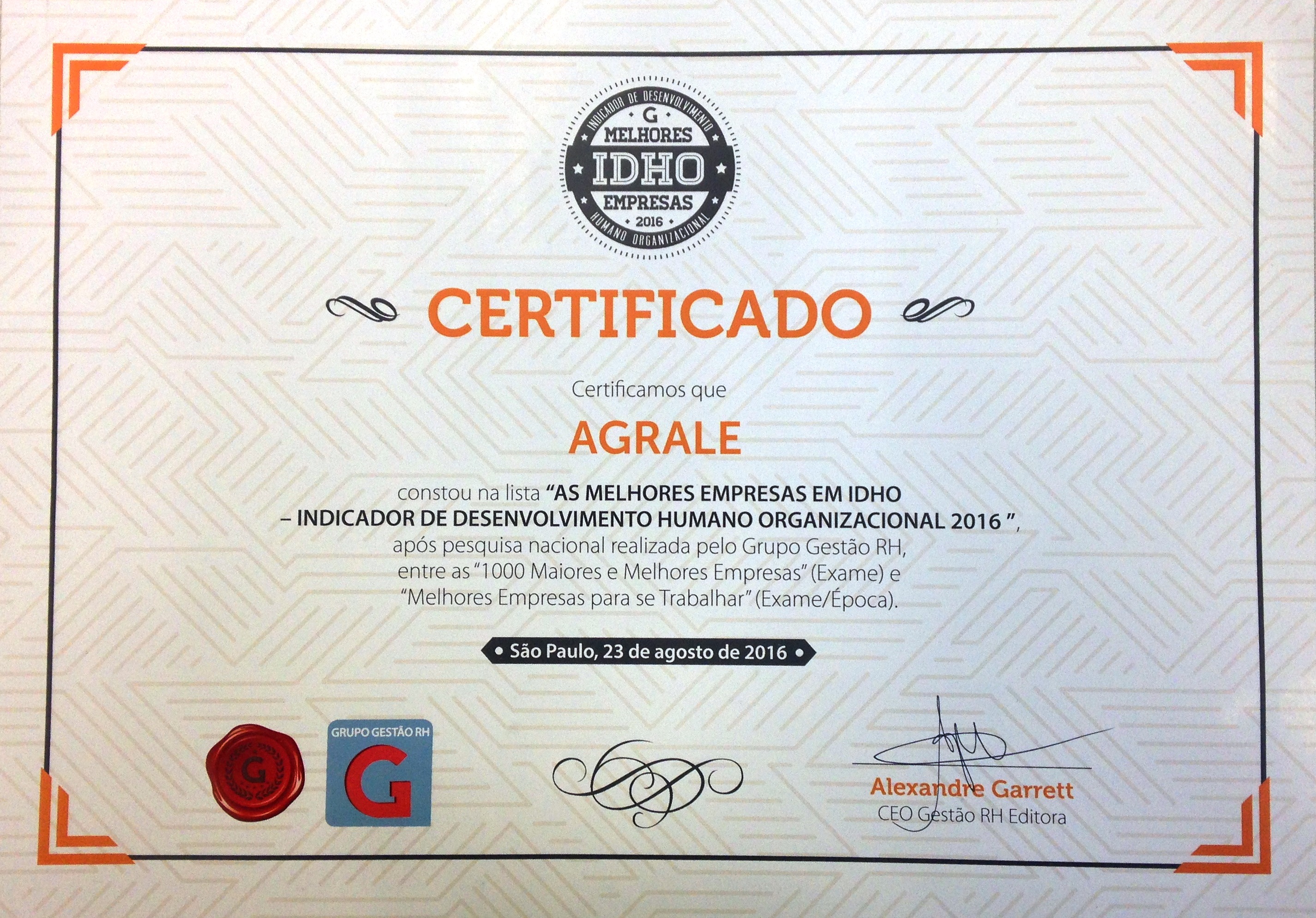 O Grupo Gestão RH certificou que a Agrale constou na listagem entre As Melhores Empresas em IDHO - Indicador de Desenvolvimento Humano Organizacional 2016.