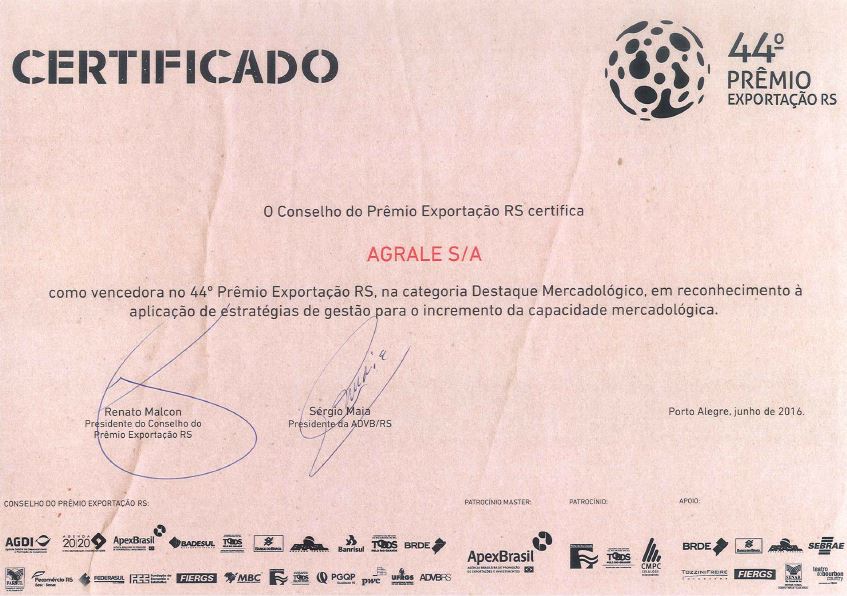 A Agrale recebeu o 44º Prêmio Exportação RS, na categoria Destaque Mercadológico, concedido pelo conselho formado por empresas ligadas às indústrias do estado do Rio Grande do Sul.